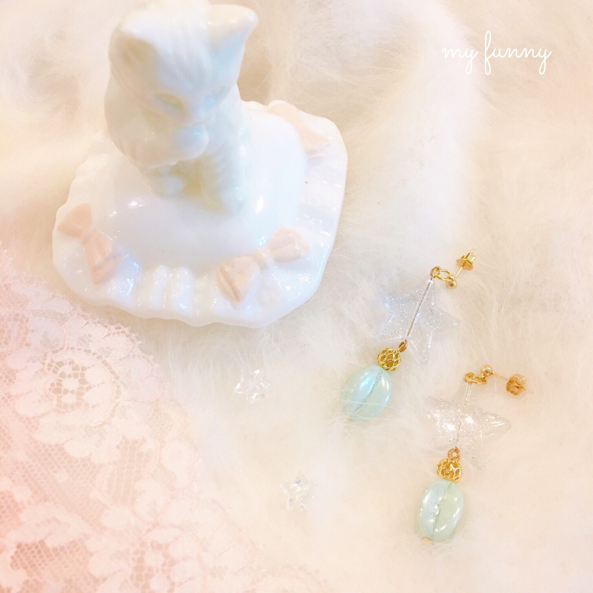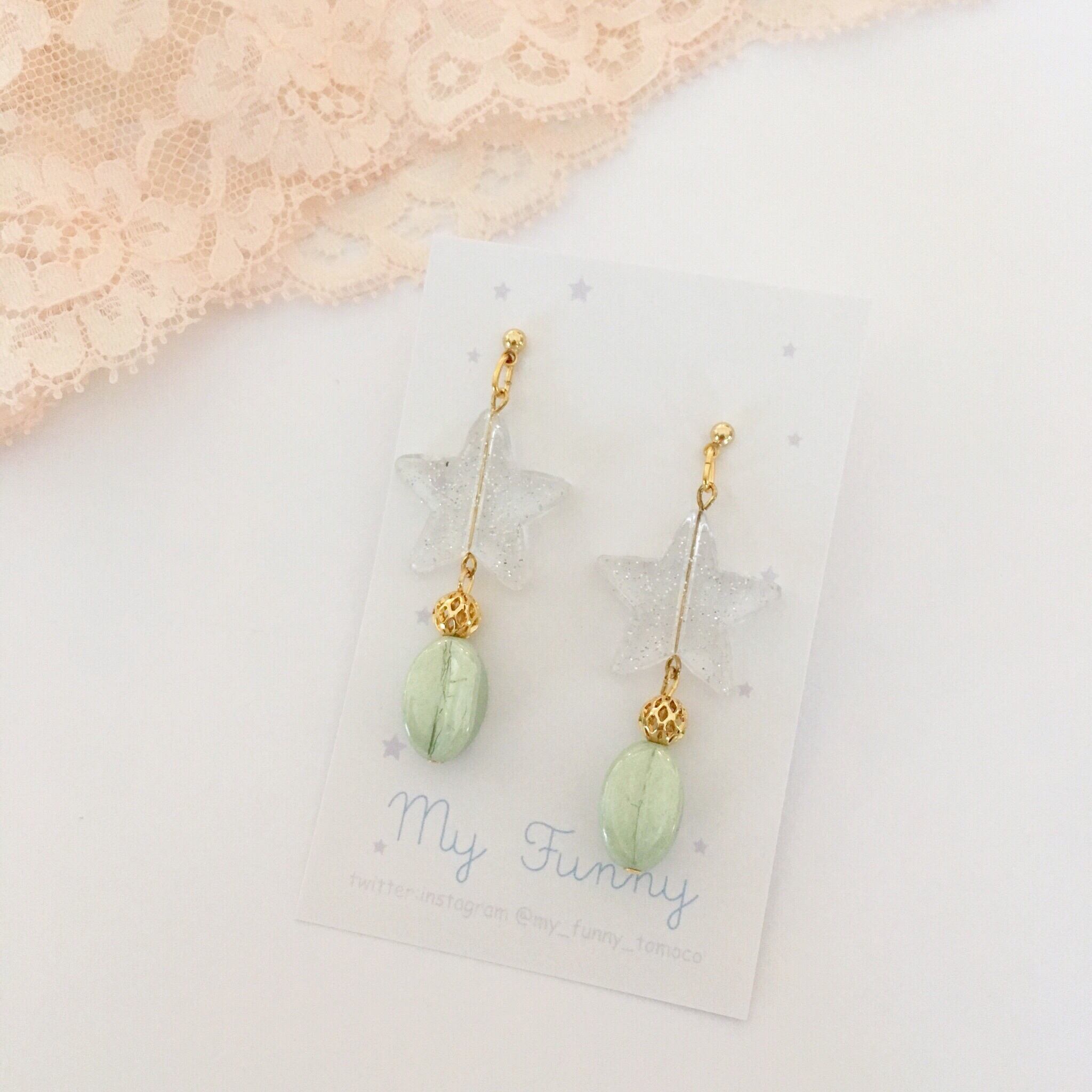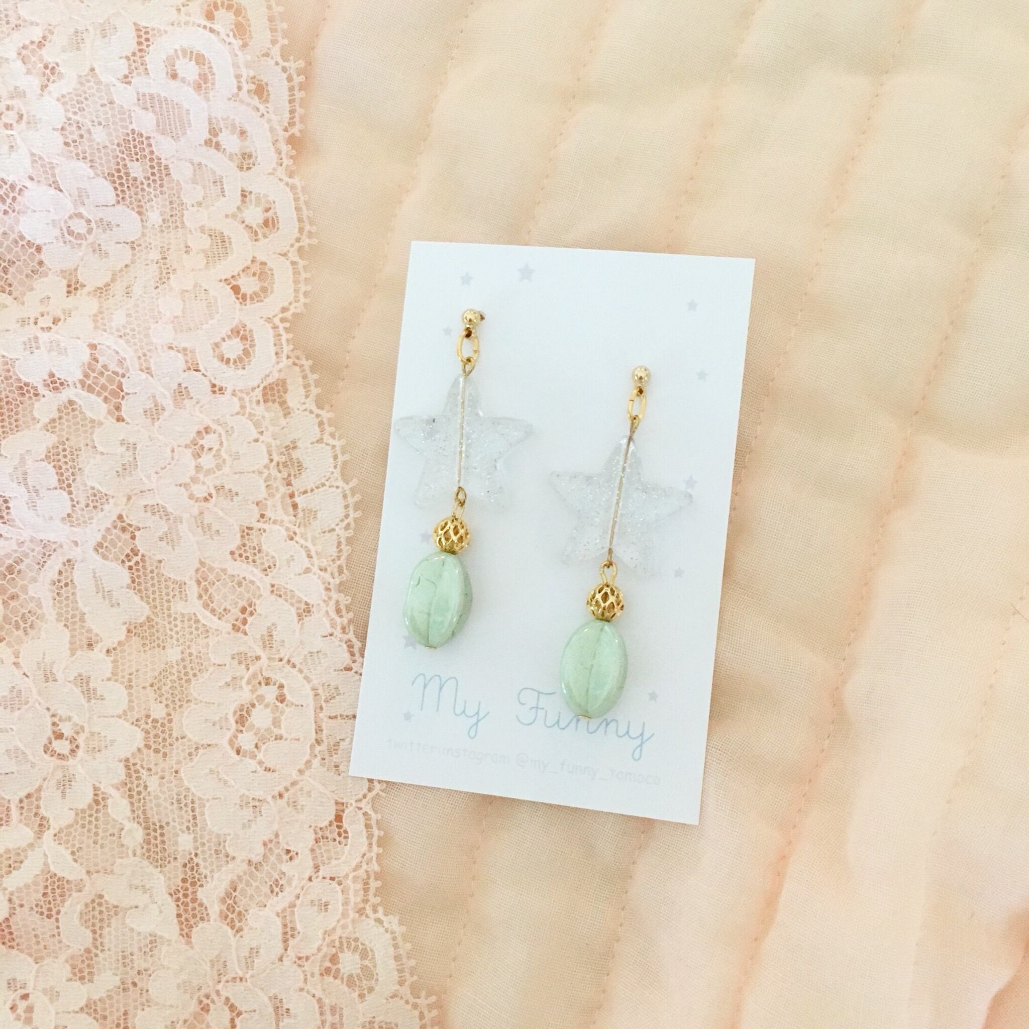 きらきらのラメが入ったお星さまと、ピスタチオみたいなチェコビーズ。